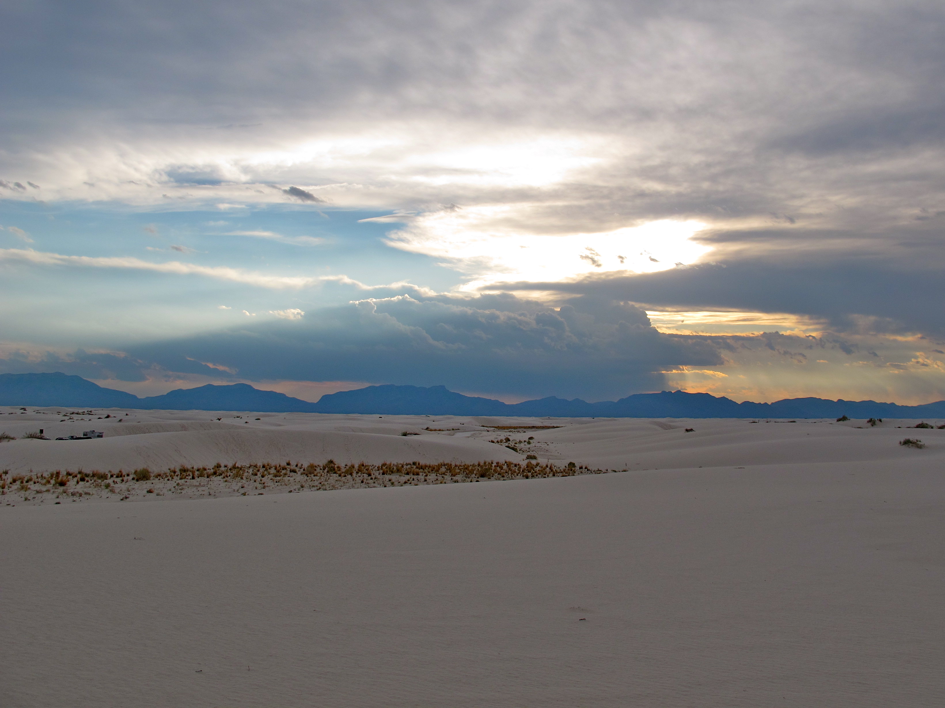 The rain clouds were rolling in as the sun set in White Sands, creating beautiful god clouds over the mountains.